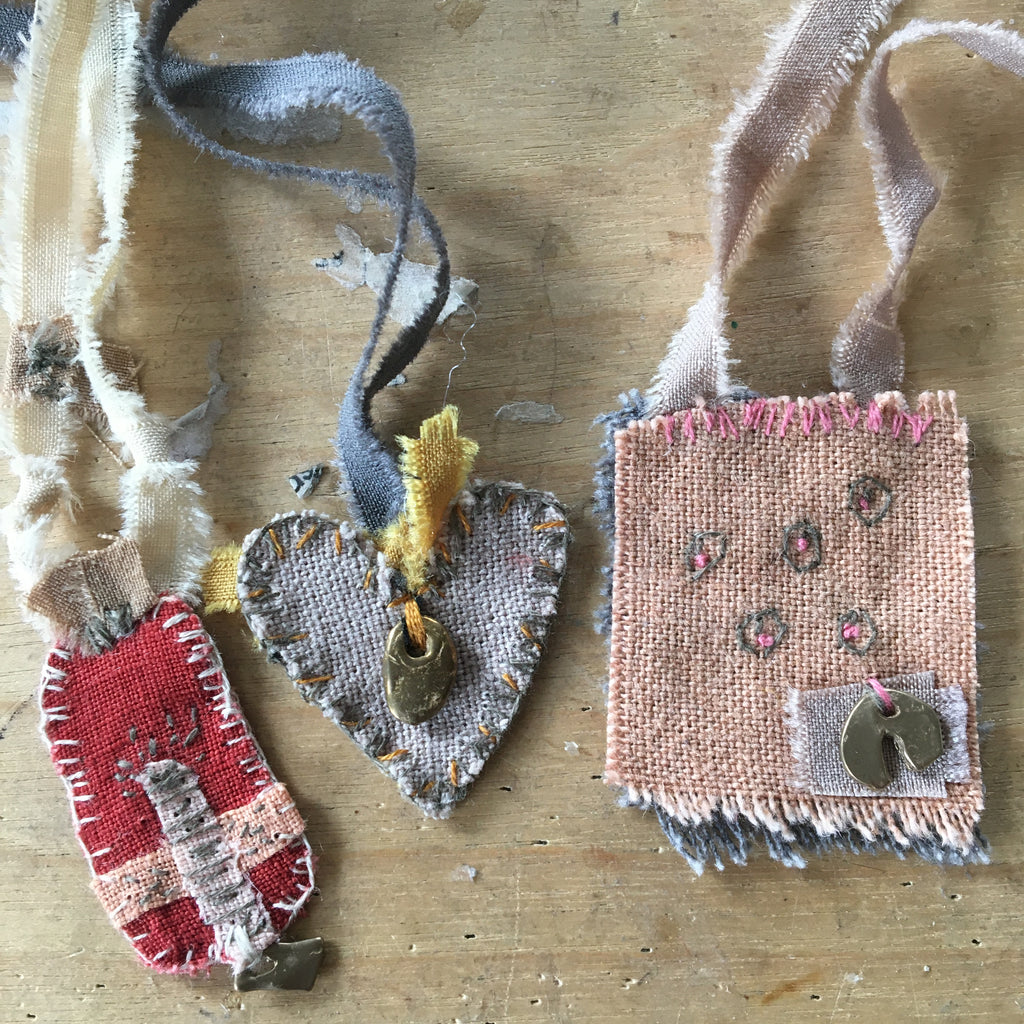Bring the beauty of Kata Golda’s plant-dyed fabrics to your own craft projects. Each little fabric bundle contains (11) 4” squares of plant-dyed 9oz organic cotton/hemp (light canvas): red, terracotta, orange, ochre, yellow, sage, green, blue, walnut, dusty rose, and charcoal. Bundles are tied with raw hand-torn silk ribbon.