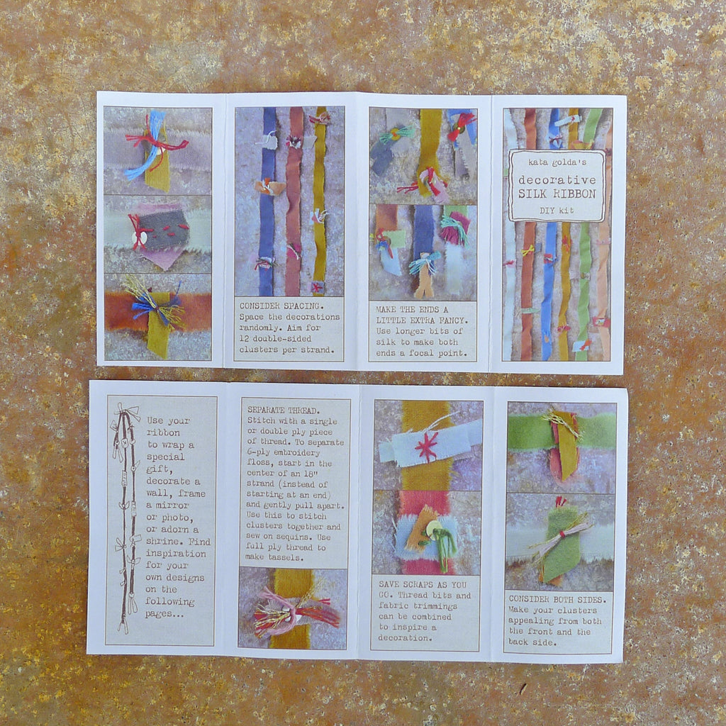 Create your own decorative silk ribbon with this sweet little kit that includes: (2) 48” strands of plant-dyed silk ribbon (the width varies between 3/8" - 1/2" as it is hand-torn), assorted colors and sizes of of plant-dyed silk, metallic thread, cotton embroidery floss, a little package of antique sequins, and a booklet with color photo inspiration.