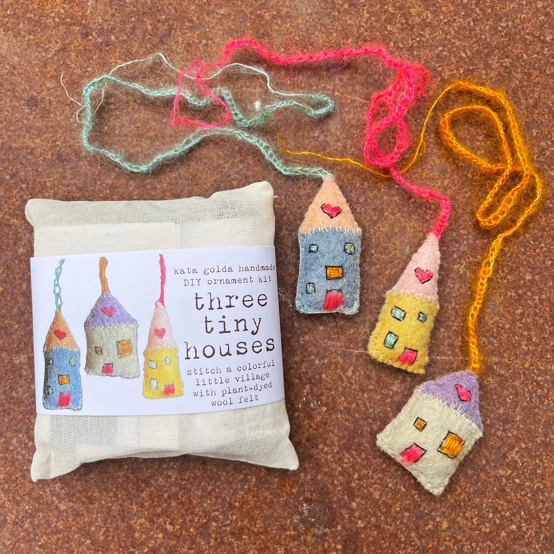 The kit includes materials and instructions to make three little house decorations stitched by hand out of plant-dyed wool felt. Houses are densely stuffed with buckwheat hulls, range in size from .75 x 1.5" to 1 x 2.25", and hang from a strand of crocheted mohair/silk yarn.