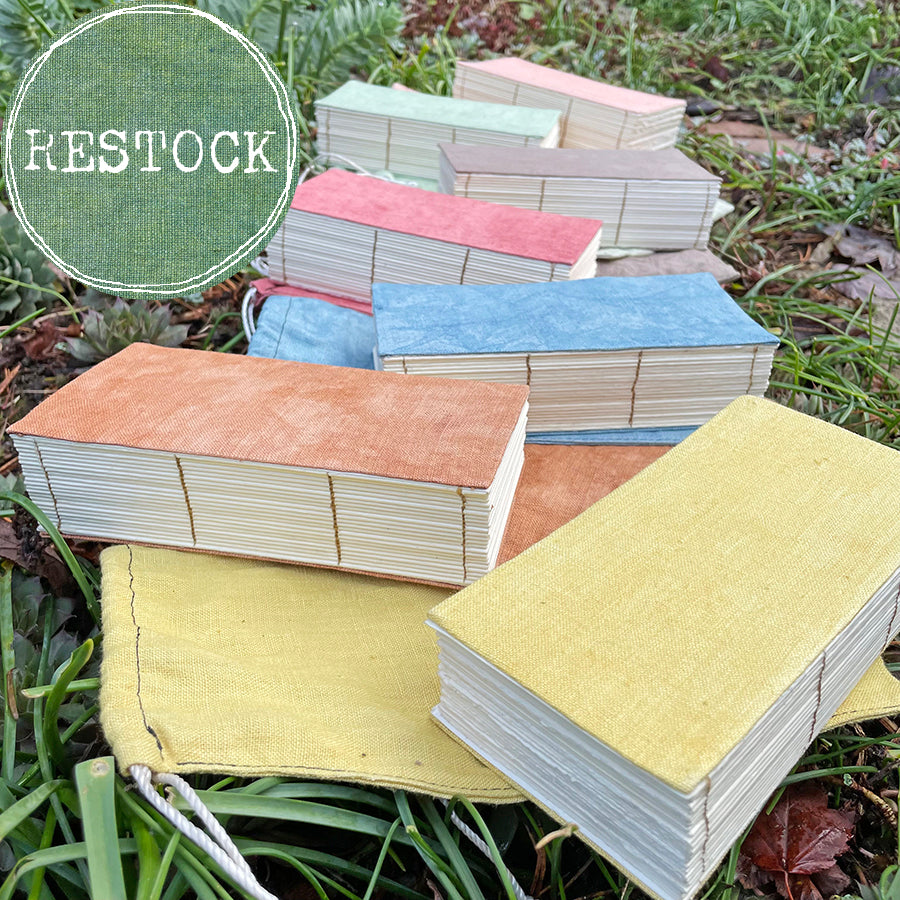 A year (or more) contained in a very thick, 366 page journal. This book is meant to be used. When we have beautiful things made by hand, we are more likely to use them in a meaningful way. I begin by hand-tearing soft white, unlined, acid-free, 80# text paper that is ideal for drawing and writing with pen or pencil. The exposed spine stitching allows the book to lay flat when it is open. Each book is covered with organic hemp linen fabric that is plant-dyed in small batches in my home dye studio. There is variation within each color, and a handful of the books have matching patches on the back side to cover imperfections in the fabric (see photo for example). Each book contains 366 pages, measures 3.25 x 6.25”, and comes tucked inside a 6 x 8.75" matching plant-dyed organic hemp linen bag.
