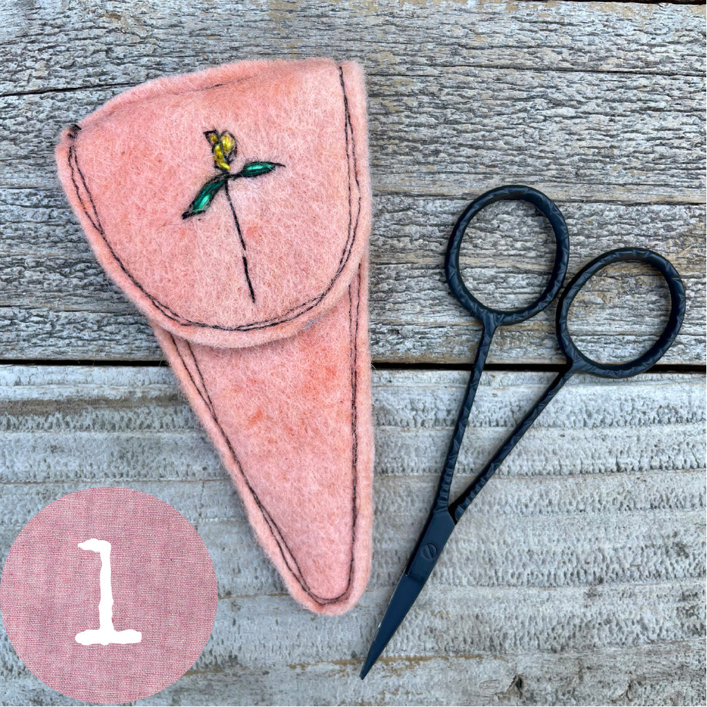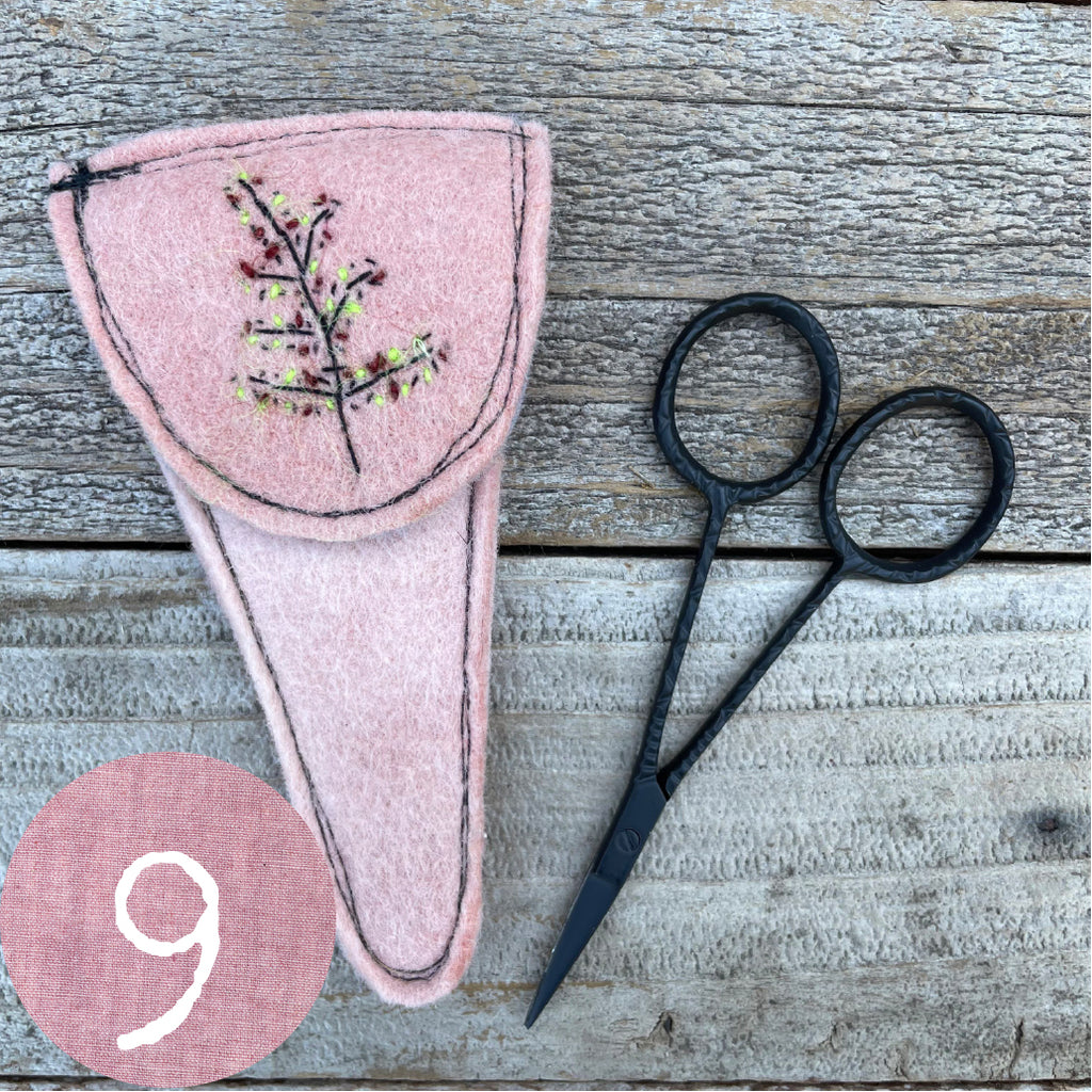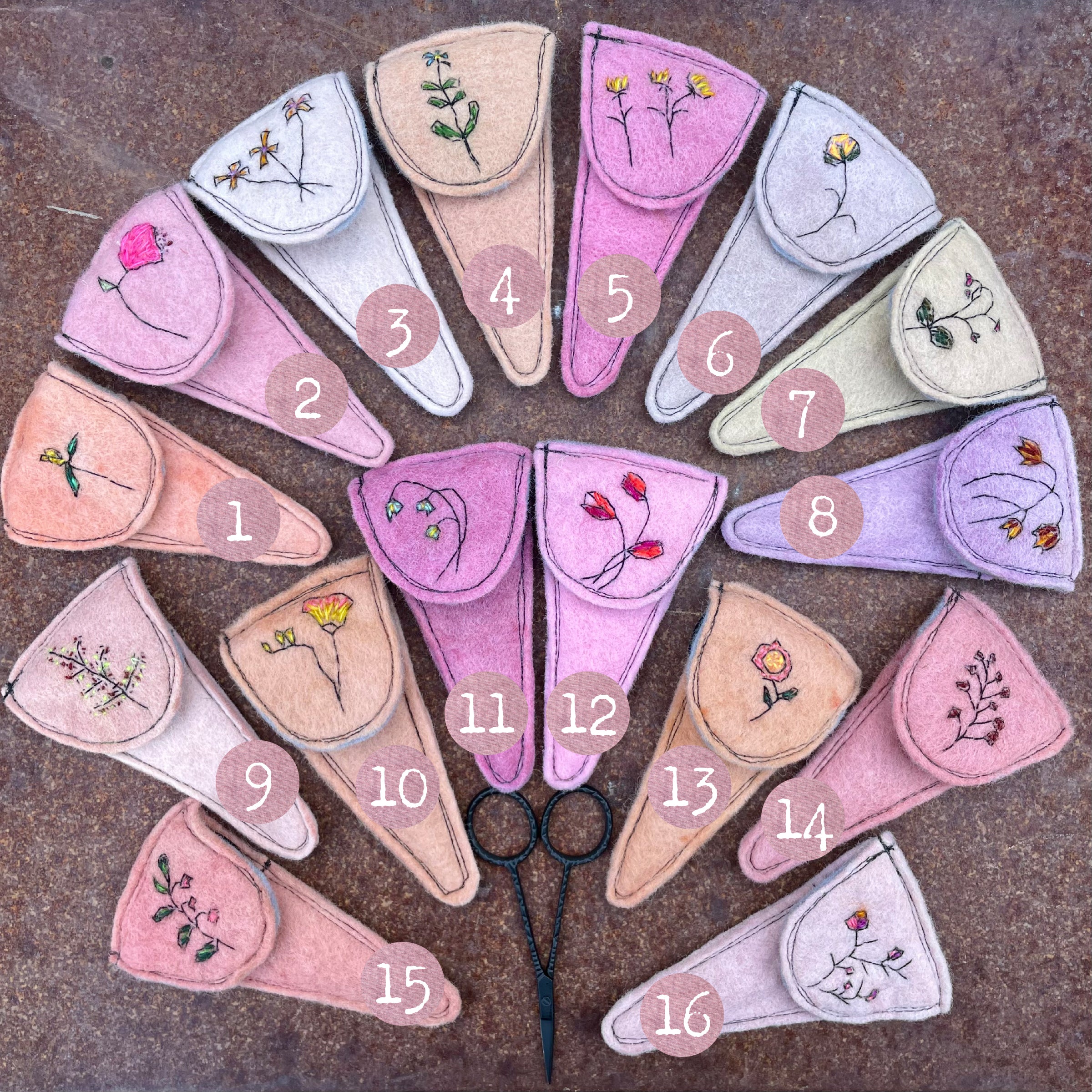 Each wool felt scissor slip features a hand-stitched botanical design hand stitched with silk/mohair from The Lamb & Kid and is machine-stitched out of plant-dyed wool felt. I dyed the felt in my home dye studio with plants and flowers from my dye garden along with additions to the dye pot from Botanical Colors. Slips measure 2.5” across at the top and are 4.5” long. A pair of lovely 3.75” long snips to treasure is included. This is a special gift for anyone who works with thread.