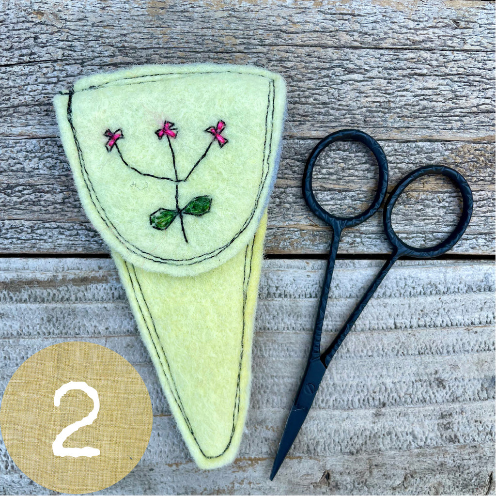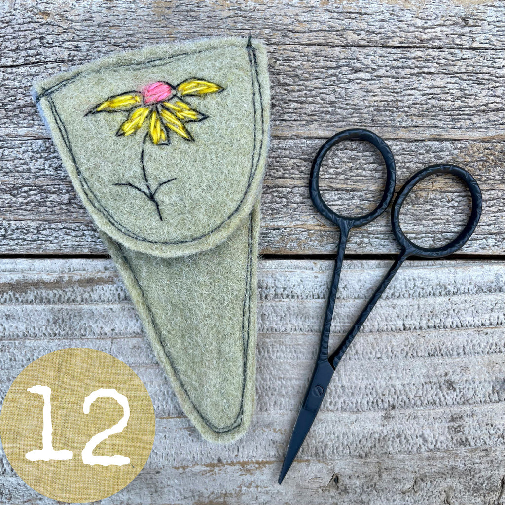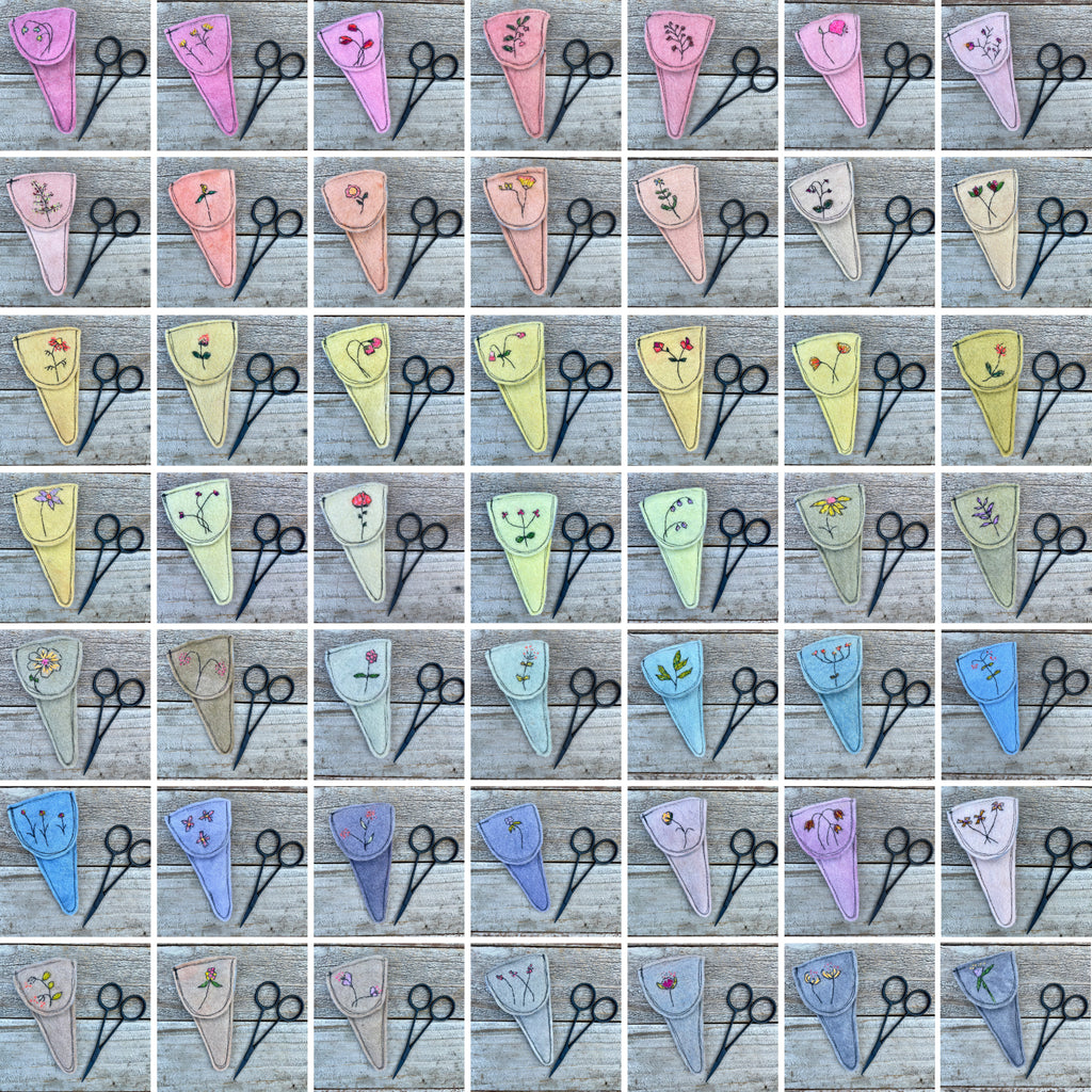 Each wool felt scissor slip features a hand-stitched botanical design hand stitched with silk/mohair from The Lamb & Kid and is machine-stitched out of plant-dyed wool felt. I dyed the felt in my home dye studio with plants and flowers from my dye garden along with additions to the dye pot from Botanical Colors. Slips measure 2.5” across at the top and are 4.5” long. A pair of lovely 3.75” long snips to treasure is included. This is a special gift for anyone who works with thread.