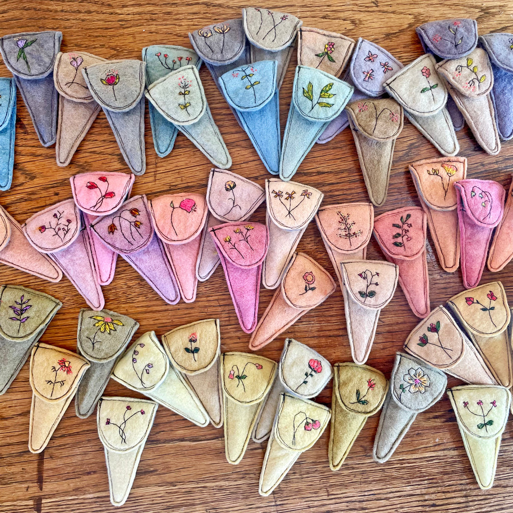 The wool felt that I used for these slips is a beautiful expression of the magic of plants. within the color families of yellow/greens, purple/blues, and peach/pinks are a whole spectrum of subtle distinction. The smallest addition to the dye pot can make a hint of variation or a huge change. I love to pull fabric out at every stage to see the nuanced differences. Find the pink/peach and blue/purple/brown collections here.