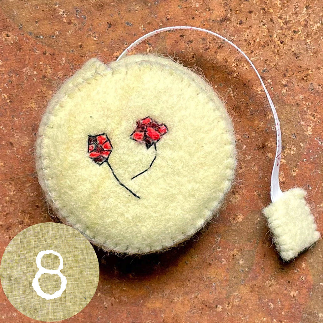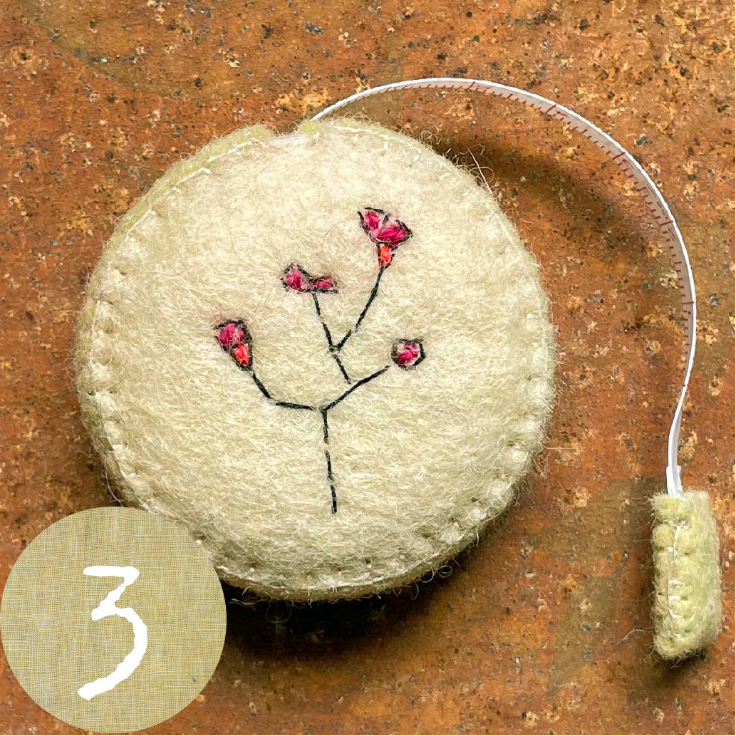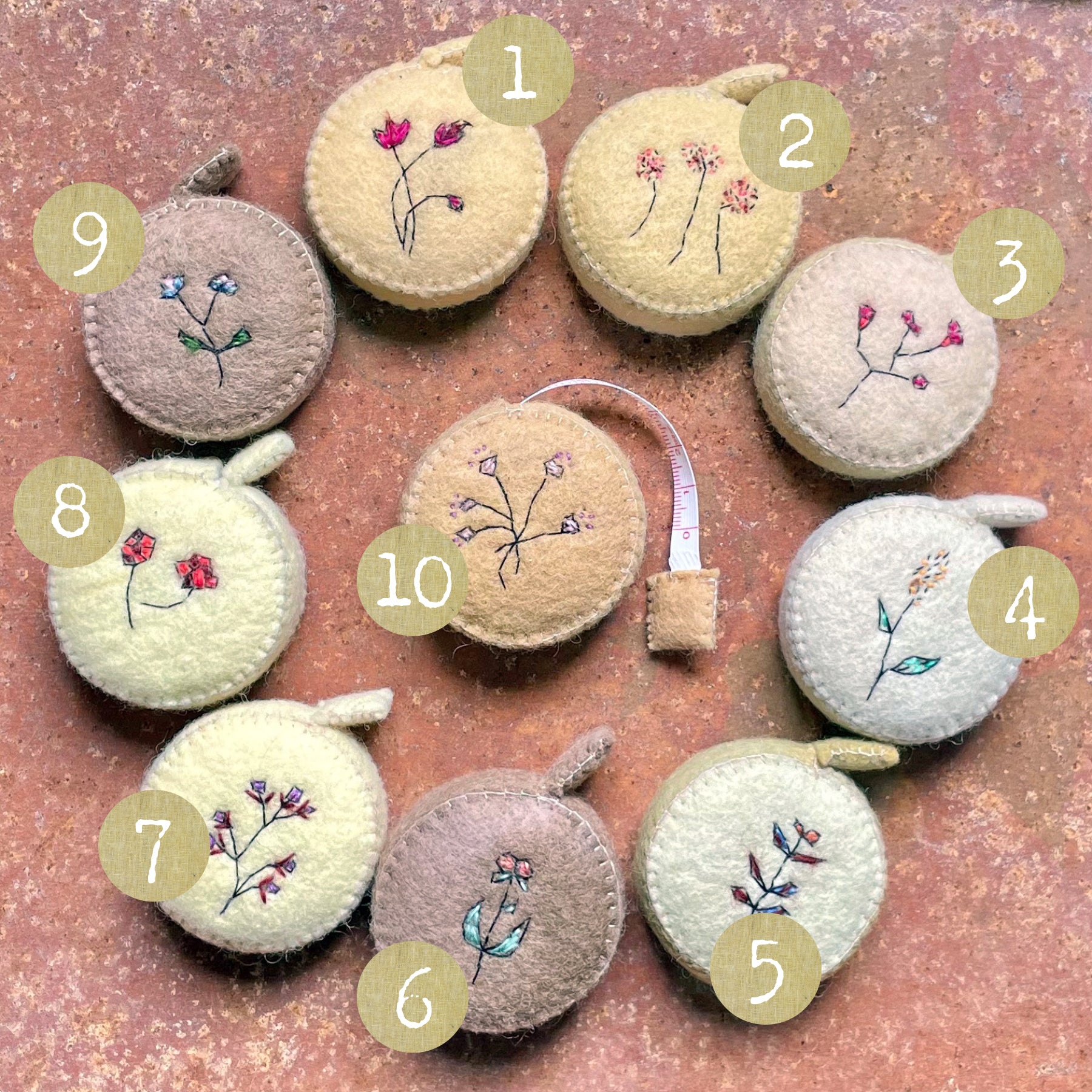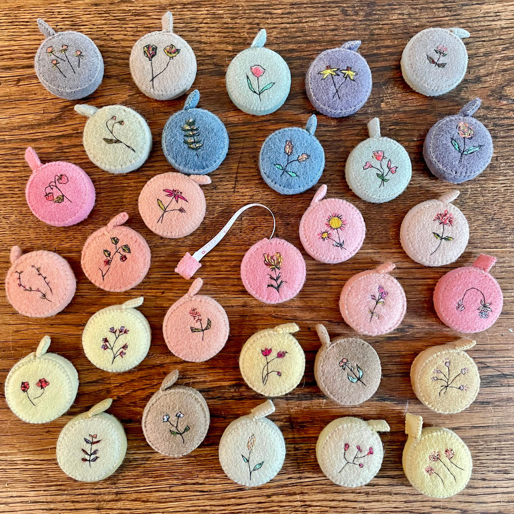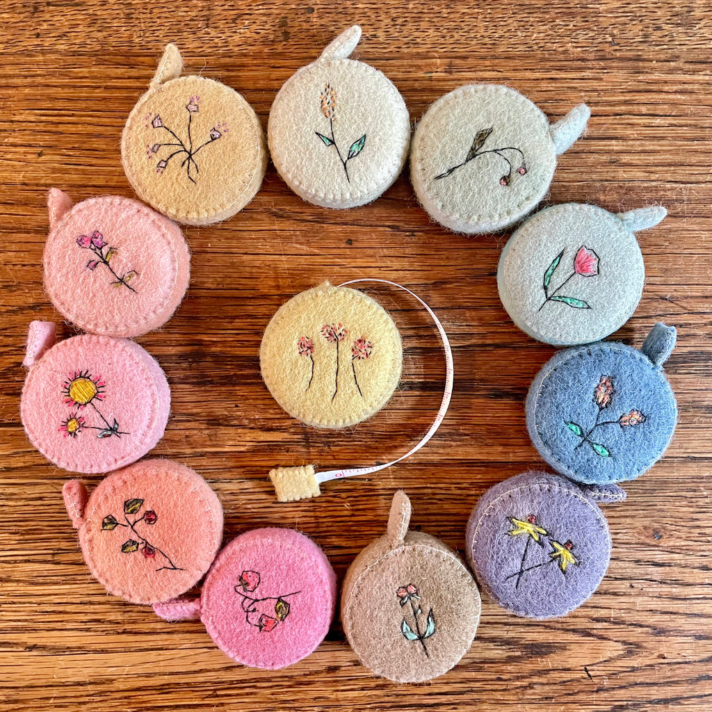 Each plant-dyed wool tape measure features a botanical design hand stitched with silk/mohair yarn from The Lamb & Kid. The back side is decorated with a small coordinating design that indicates the location of the retract button. I dyed the felt in my home dye studio with plants and flowers from my dye garden along with additions to the dye pot from Botanical Colors. Tape measures are about a 3” circle. This is a special gift for anyone who loves to make things by hand. They pair beautifully with a plant-dyed wool felt scissor slip.