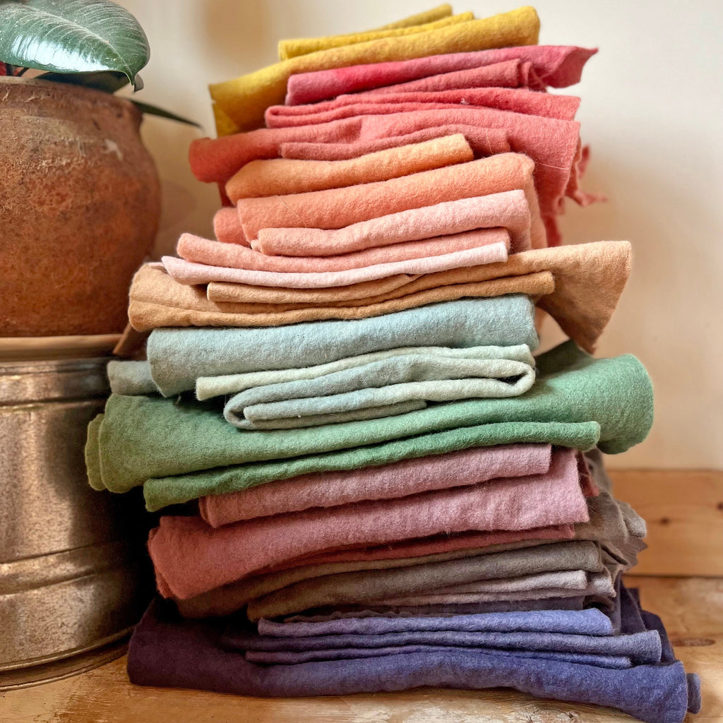 The wool felt that I used for these tape measures is a beautiful expression of the magic of plants. Within the color families of yellow/browns, purple/blues, and peach/pinks are a whole spectrum of subtle distinction. The smallest addition to the dye pot can make a hint of variation or a huge change. I love to pull fabric out at every stage to see the nuanced differences. Find the peach/pink and blue/purple/grey collections here.