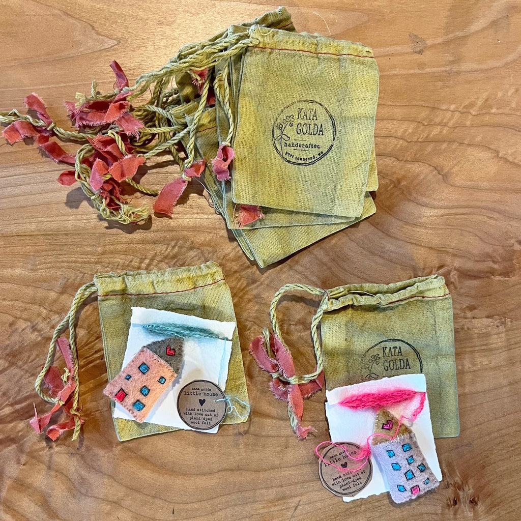 Each house is attached to a sturdy card and tucked into a yellow plant-dyed muslin bag dyed with marigolds from my dye garden and embellished with red silk ribbon. *Note house #20 is not pictured in the group picture.