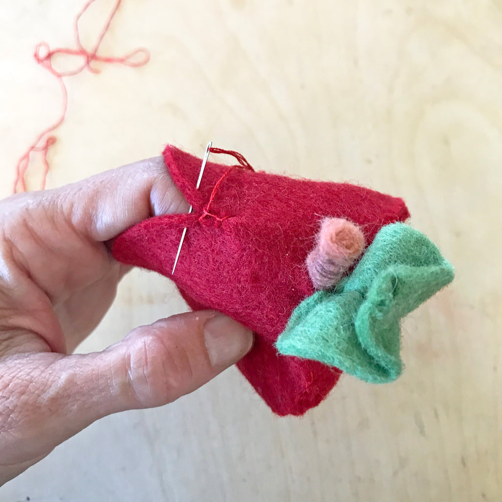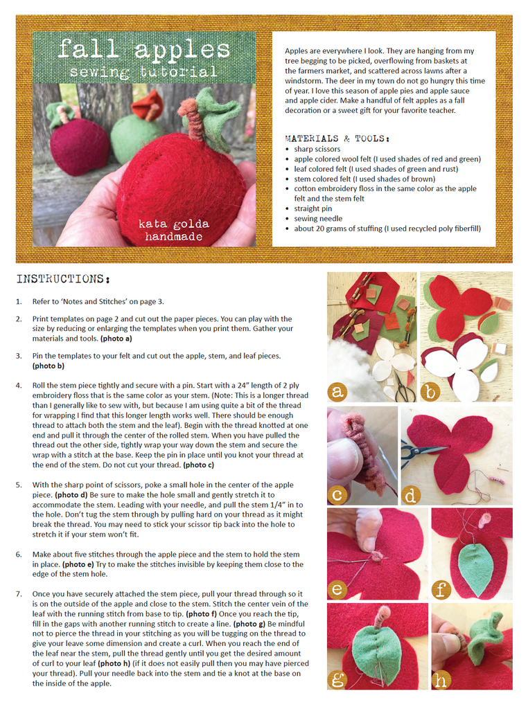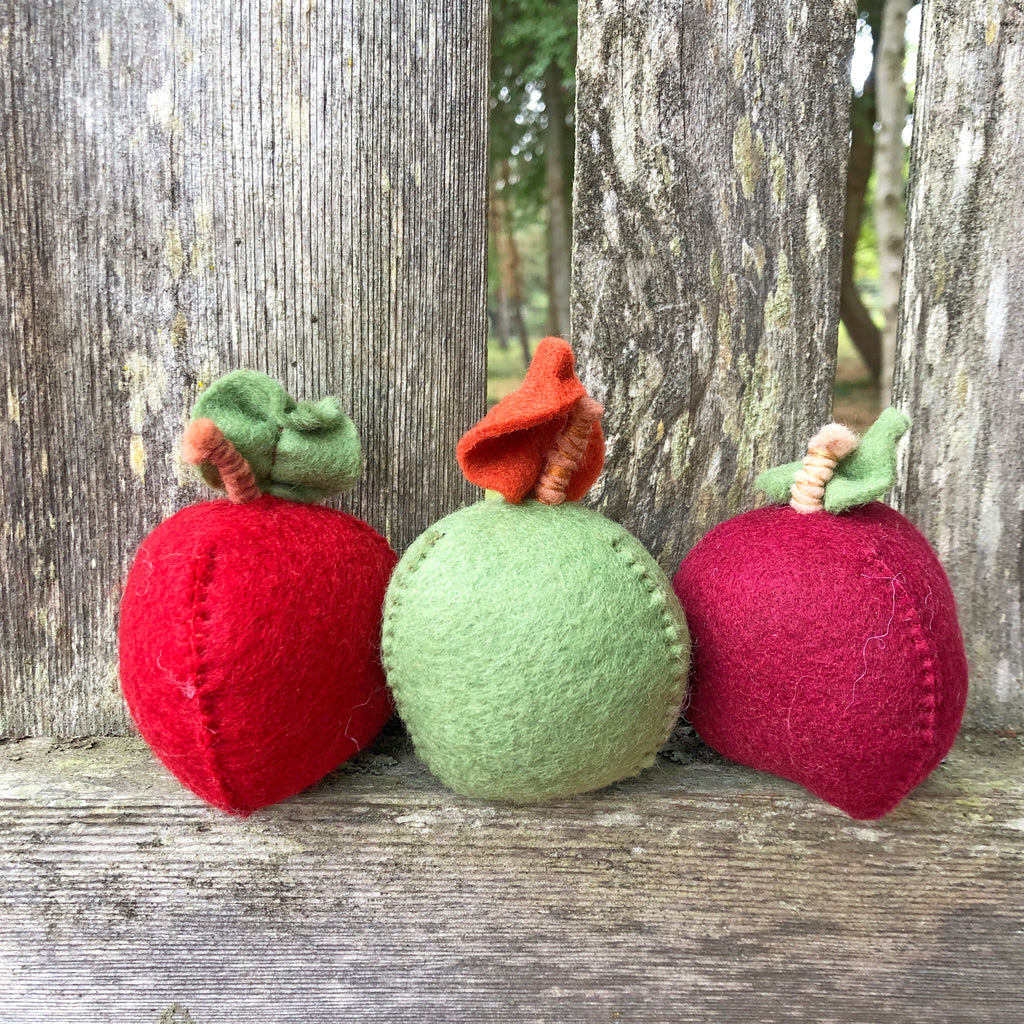Apples are everywhere I look. They are hanging from my tree begging to be picked, overflowing from baskets at the farmers market, and scattered across lawns after a windstorm. The deer in my town do not go hungry this time of year. I love this season of apple pies and apple sauce and apple cider. Make a handful of wool felt apples as a fall decoration or a sweet gift for your favorite teacher.