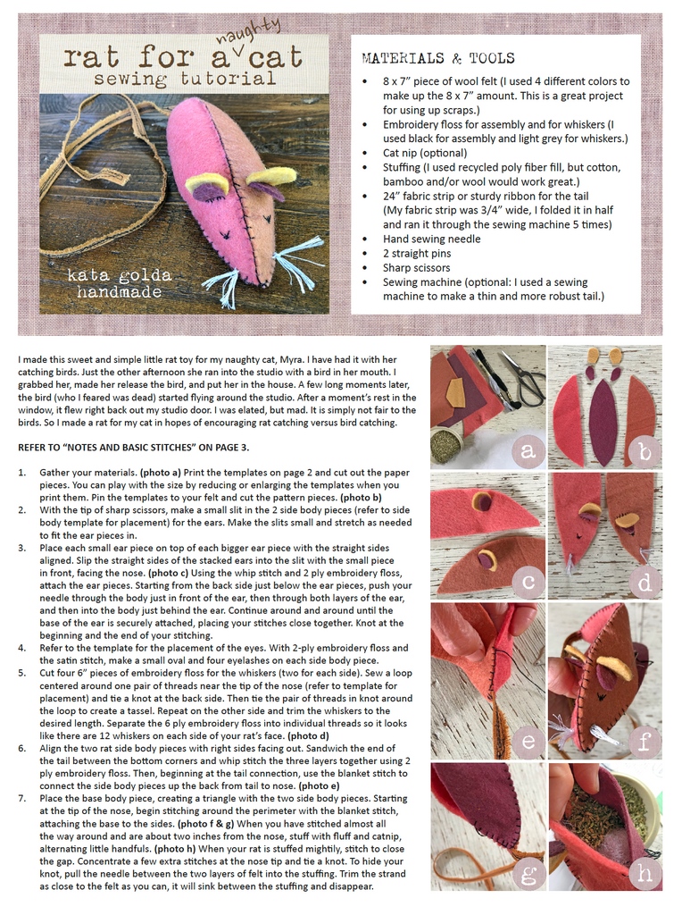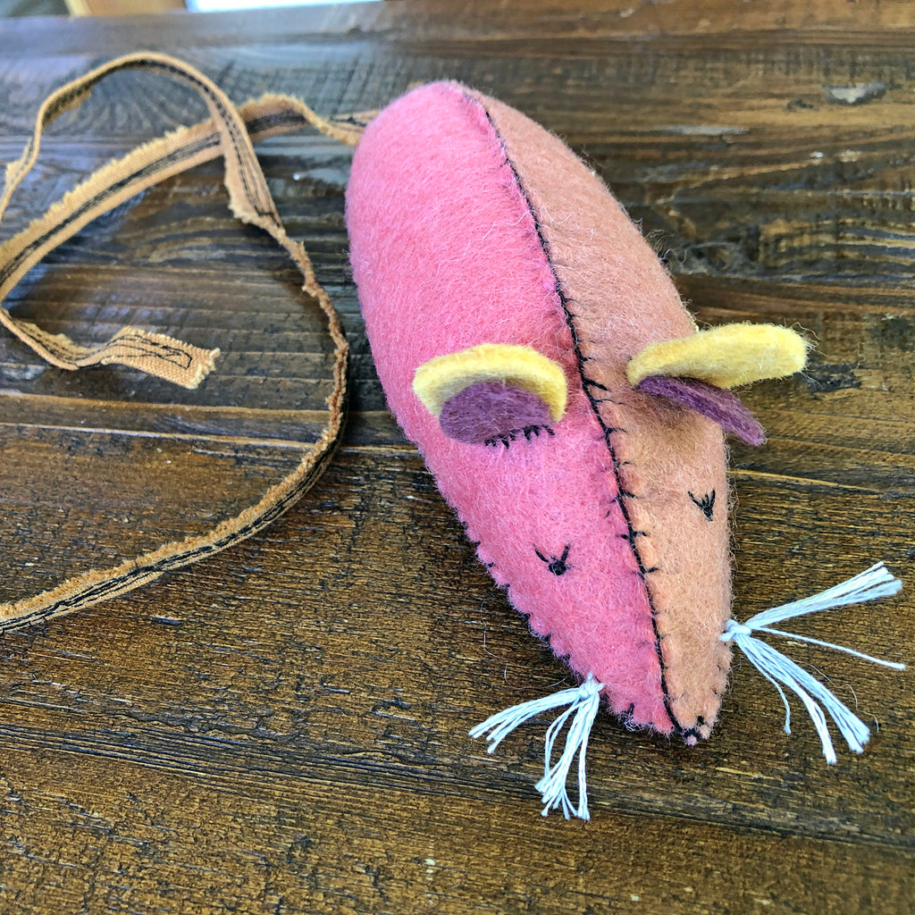 I made this sweet and simple little rat toy for my naughty cat, Myra. I have had it with her catching birds. Just the other afternoon she ran into the studio with a bird in her mouth. I grabbed her, made her release the bird, and put her in the house. A few long moments later, the bird (who I feared was dead) started flying around the studio. After a moment’s rest in the window, it flew right back out my studio door. I was elated, but mad. It is simply not fair to the birds. So I made a rat for my cat in hopes of encouraging rat catching versus bird catching.