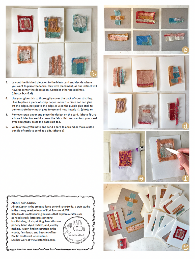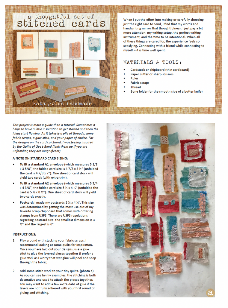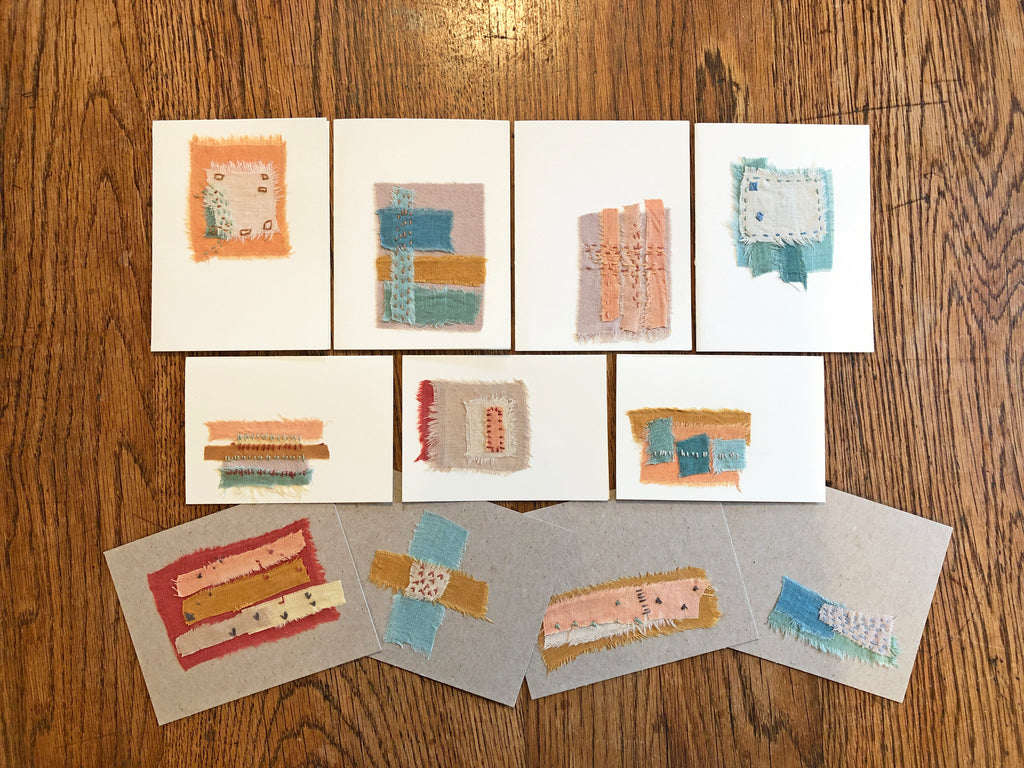 This project is more a guide than a tutorial. Sometimes it helps to have a little inspiration to get started and then the ideas start flowing. All it takes is a pile of threads, some fabric scraps, a glue stick, and your paper of choice. For the designs on the cards pictured, I was feeling inspired by the Quilts of Gee’s Bend (look them up if you are unfamiliar, they are magnificent).