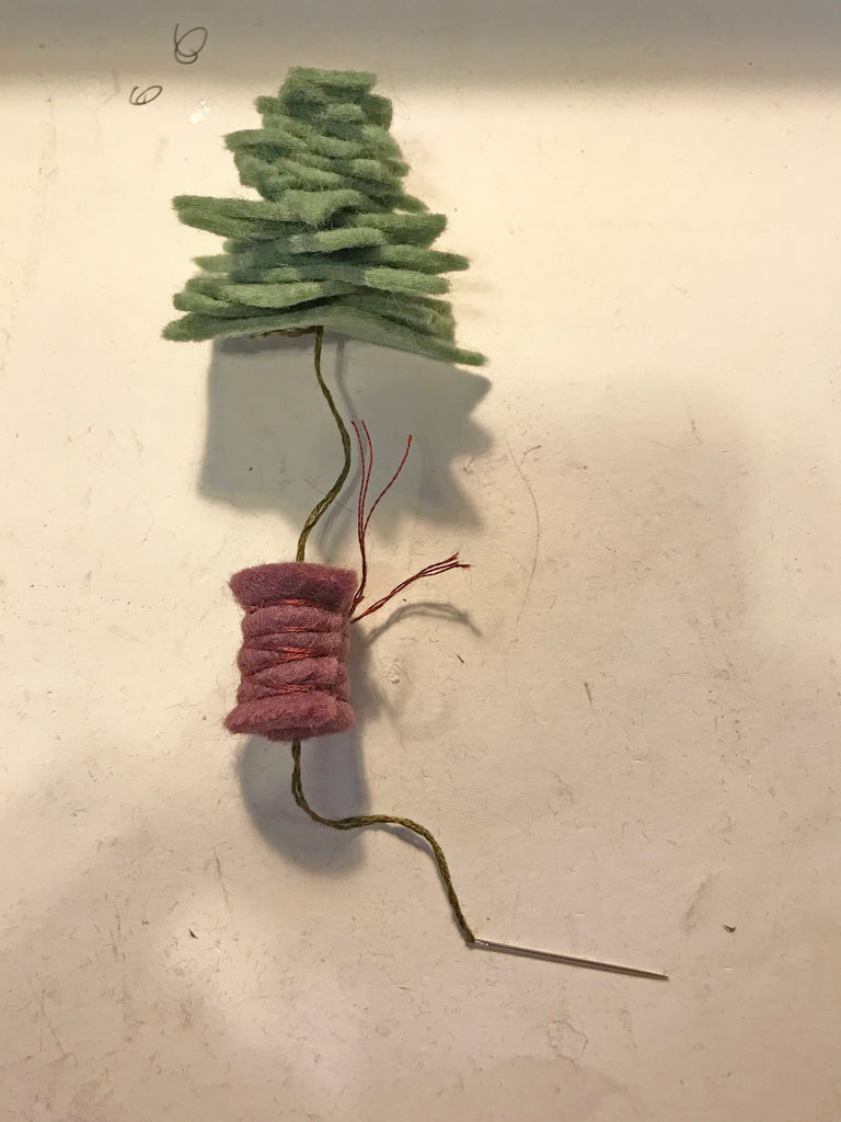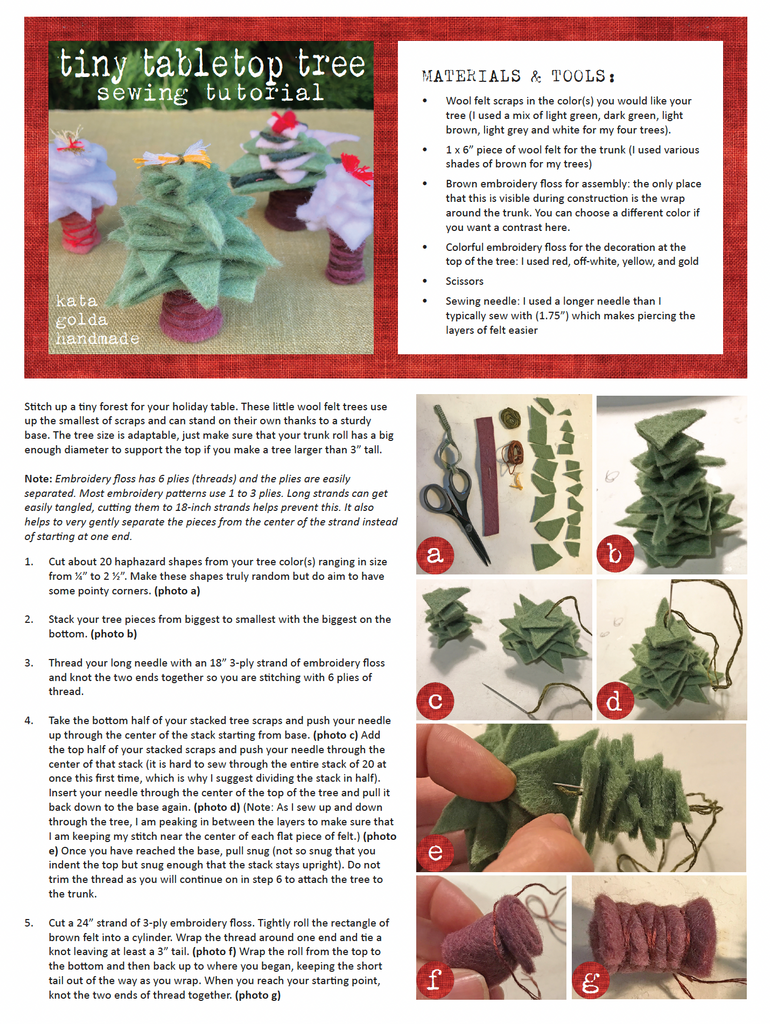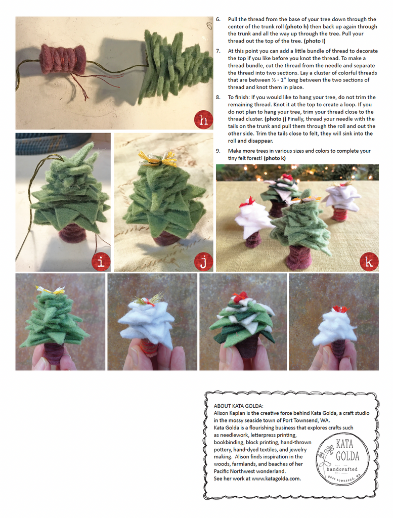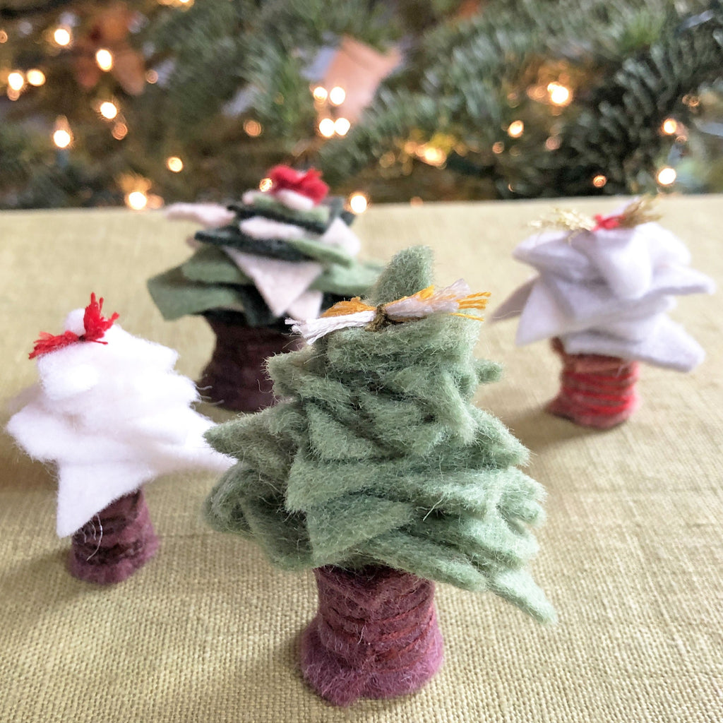 Stitch up a tiny forest for your holiday table. These little wool felt trees use up the smallest of scraps and can stand on their own thanks to a sturdy base. The tree size is adaptable, just make sure that your trunk roll has a big enough diameter to support the top if you make a tree larger than 3” tall.