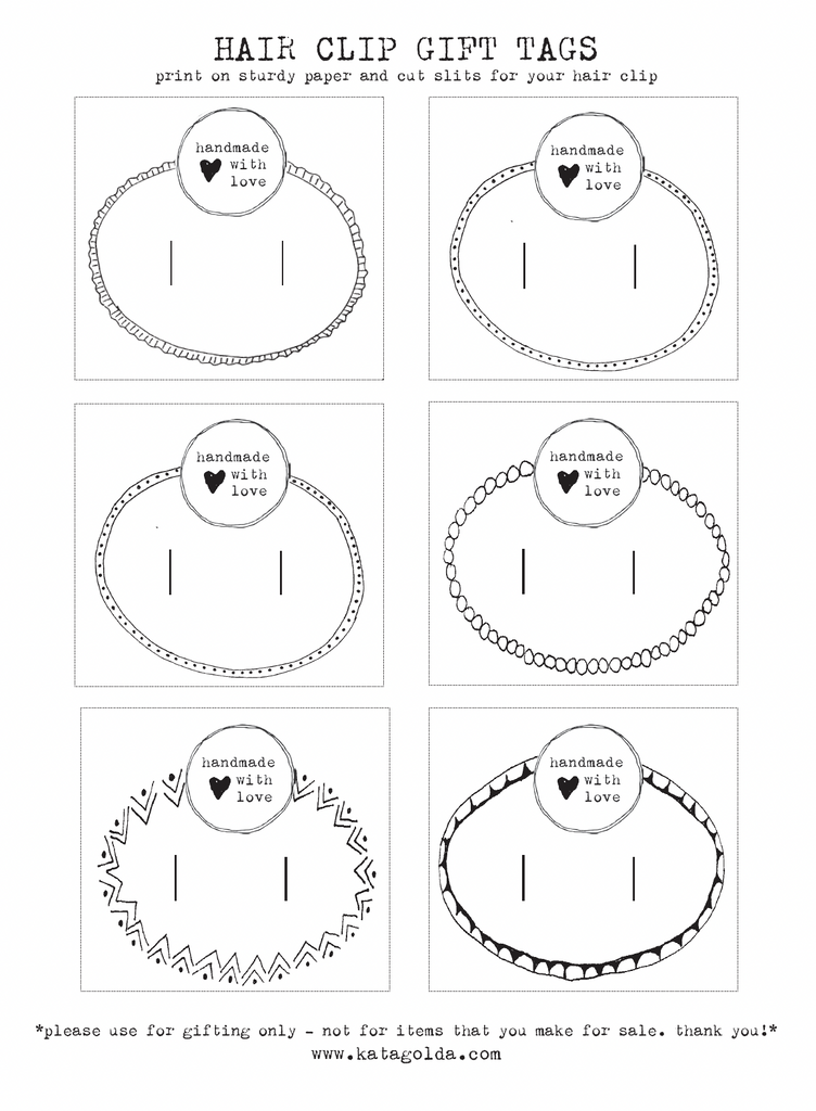 This is my favorite way to dress up a plain snap hair clip. They are endlessly customizable and make the sweetest gifts. This is the perfect project for digging into your remnant stash. I have included a full page of gift tags - I like to print these on sturdy kraft paper (though any cardstock will do) and slide the clips through the slits.