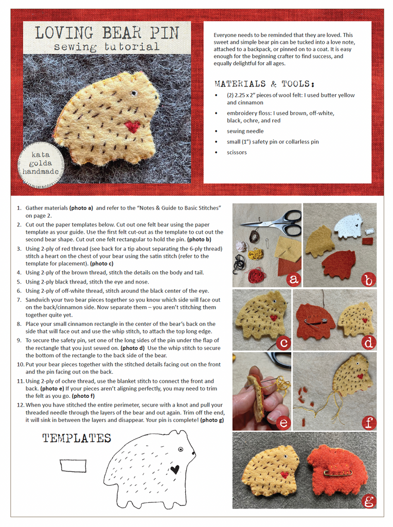 Everyone needs to be reminded that they are loved. This sweet and simple bear pin can be tucked into a love note, attached to a backpack, or pinned on to a coat. It is easy enough for the beginning crafter to find success, and equally delightful for all ages.
