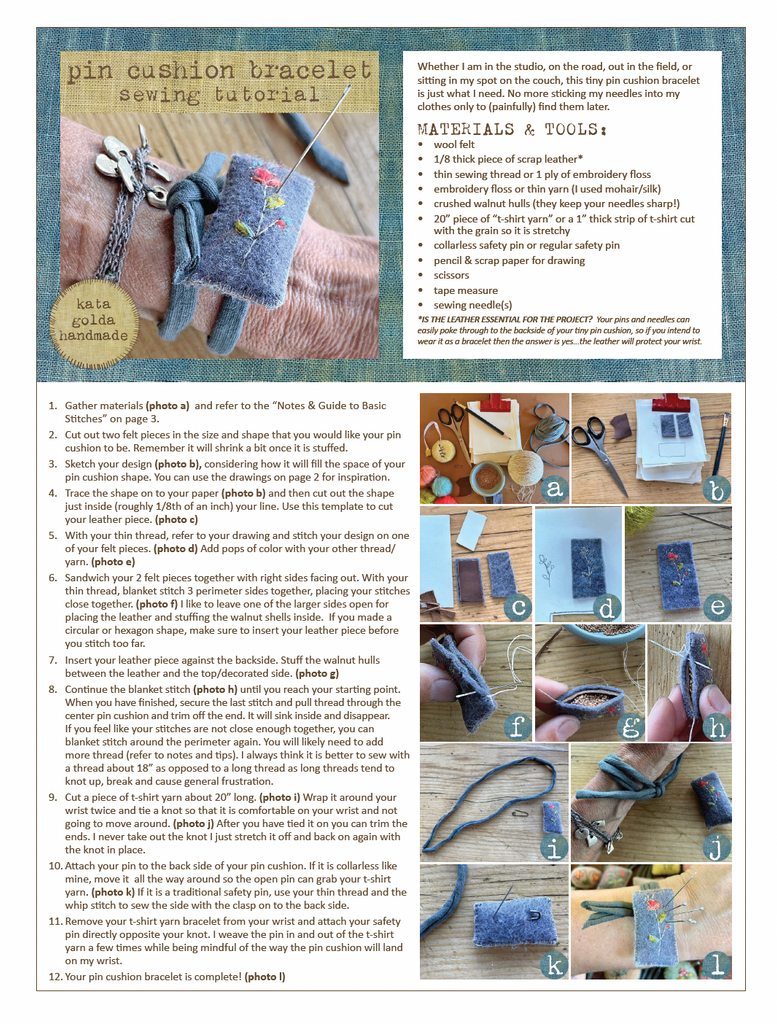 Whether I am in the studio, on the road, out in the field, or sitting in my spot on the couch, this tiny pin cushion bracelet is just what I need. No more sticking my needles into my clothes only to (painfully) find them later.