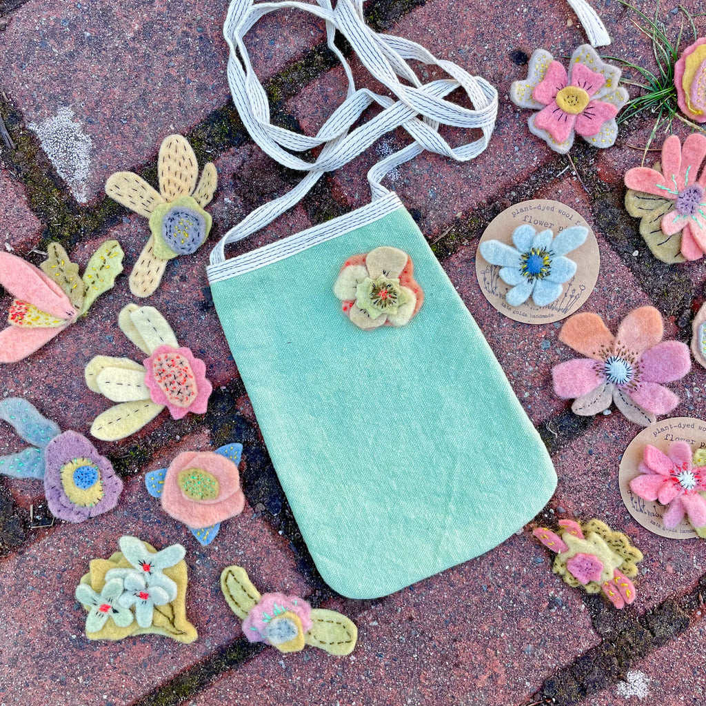 These wool felt flower pins are the perfect way to use up my plant-dyed wool felt remnants. These scraps feel extra precious as I grew the flowers in my dye garden and dyed the felt in my home dye studio. Flower pins are a sweet embellishment for a plant-dyed pocket purse, a tote bag, or a coat.
