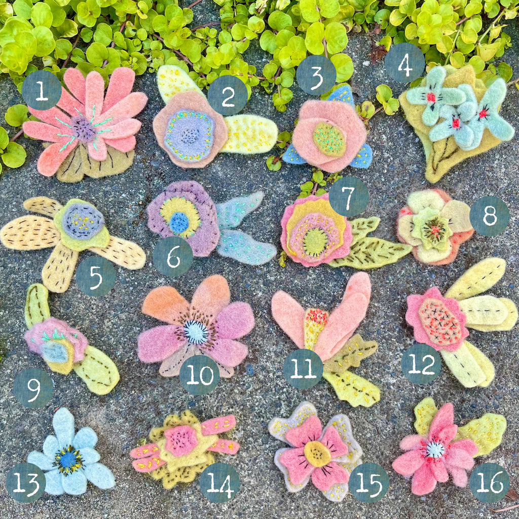 Flowers are hand stitched and range in size from 3 x 1" to 3.5 x 3.5".
