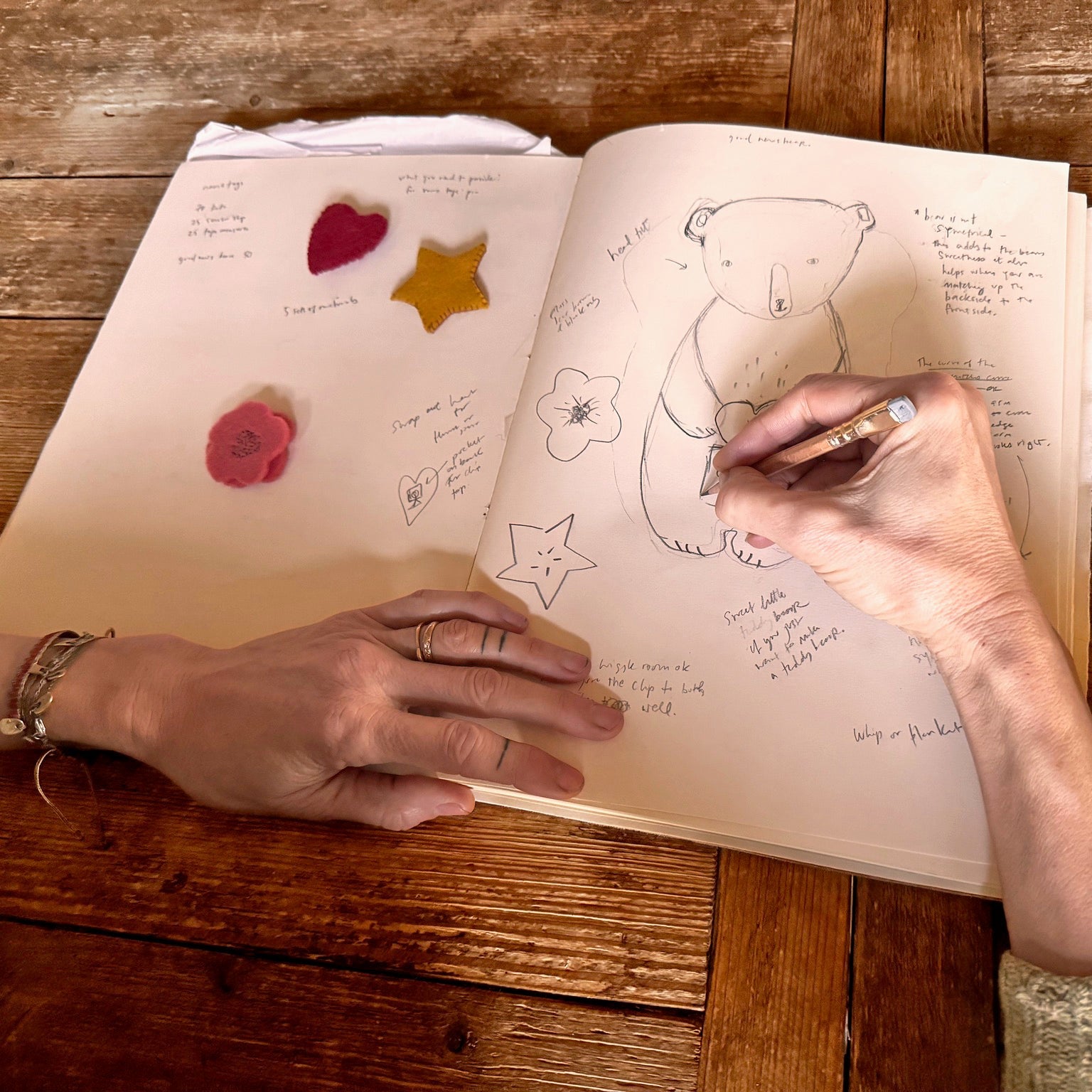 Interchangeable covers (heart, star, and flower) hide a metal binder clip that is stitched to the belly of the bear. Change the design with your whim or the season. The finished bear measures 3 x 7".