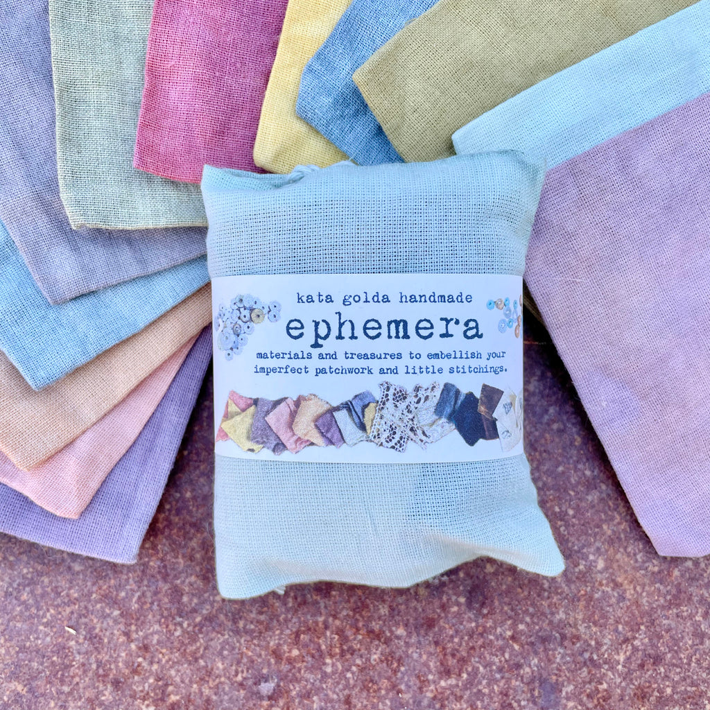 Each bundle of ephemera is packaged in a plant-dyed muslin bag (colors vary, measures 4 x 6").