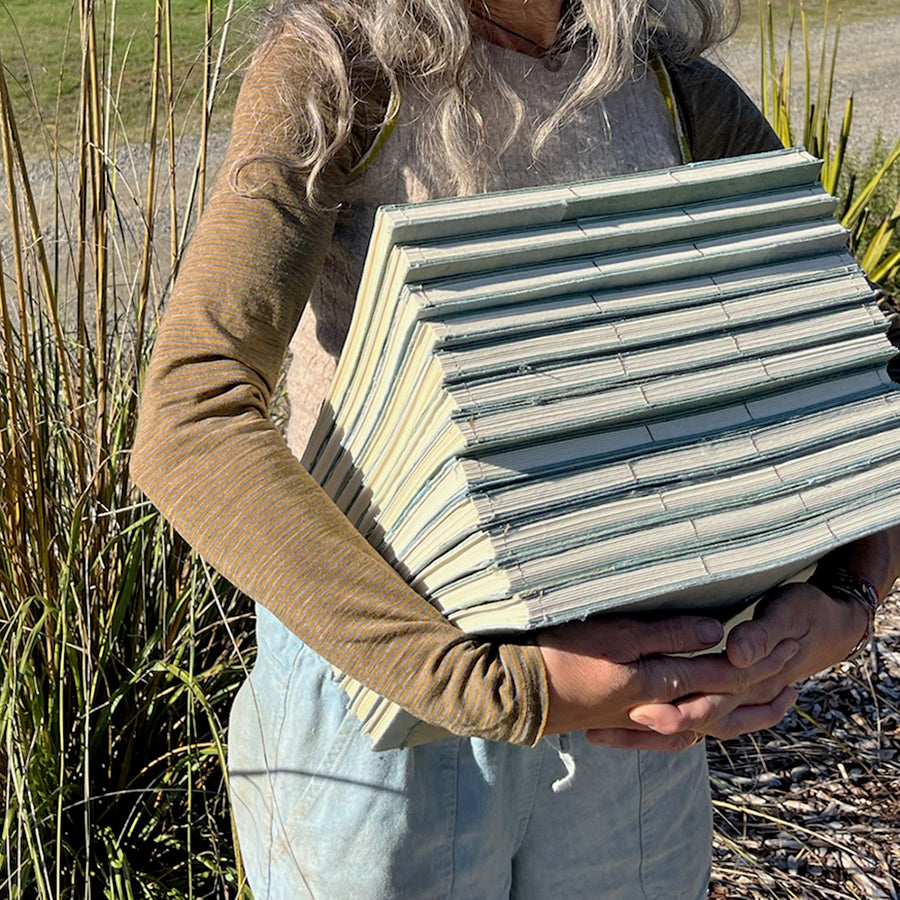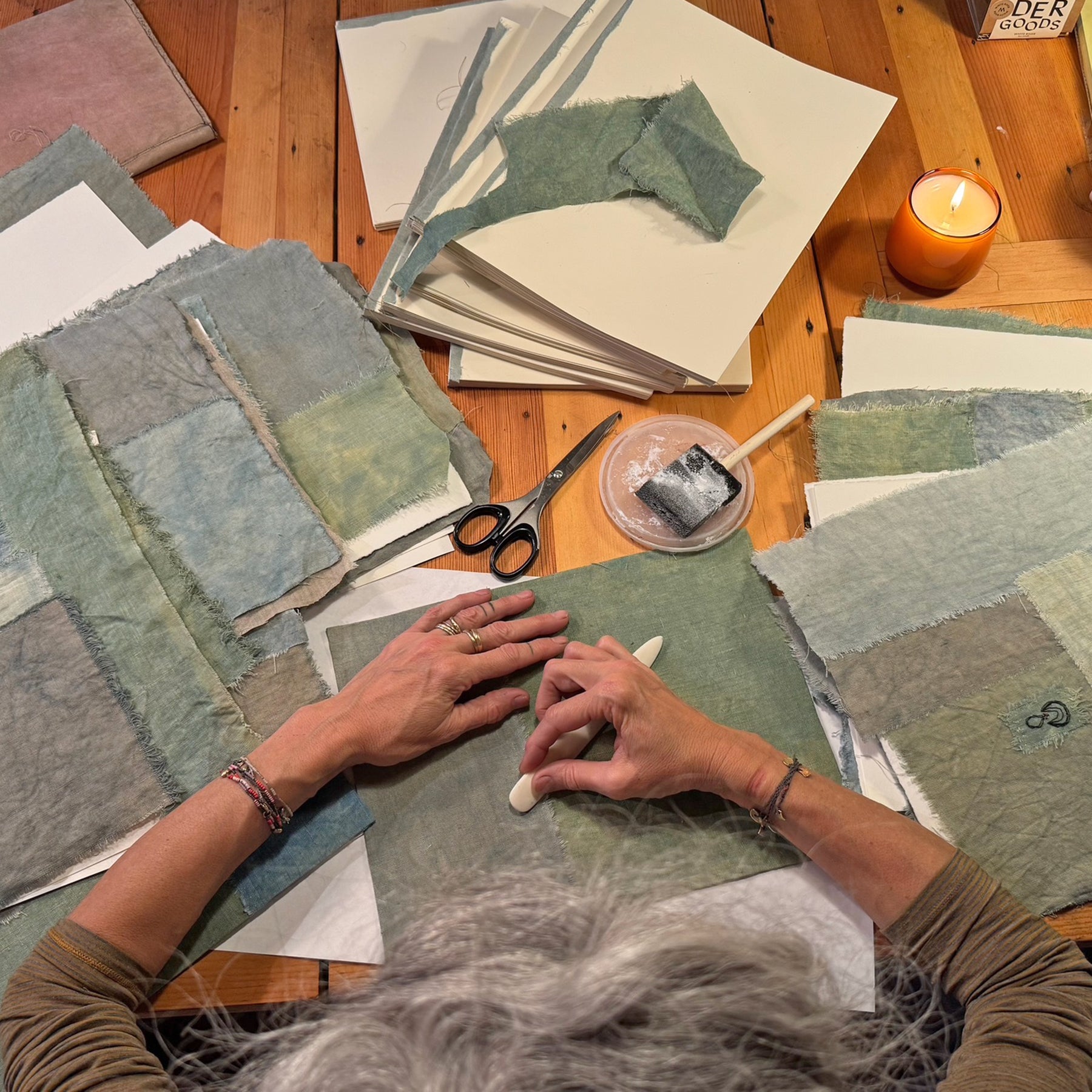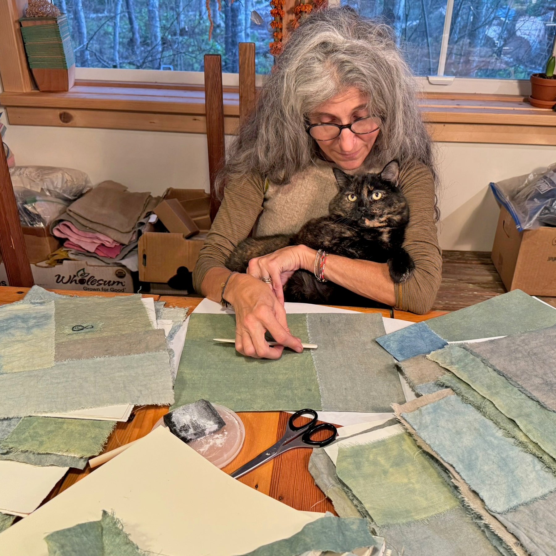 Each book contains 116 pages, measures 9.5 x 12.5" and is covered with organic cotton/hemp fabric that is plant-dyed in small batches in my dye studio with plants from my dye garden.