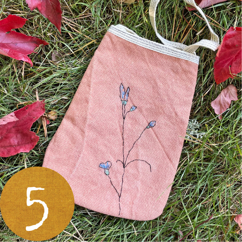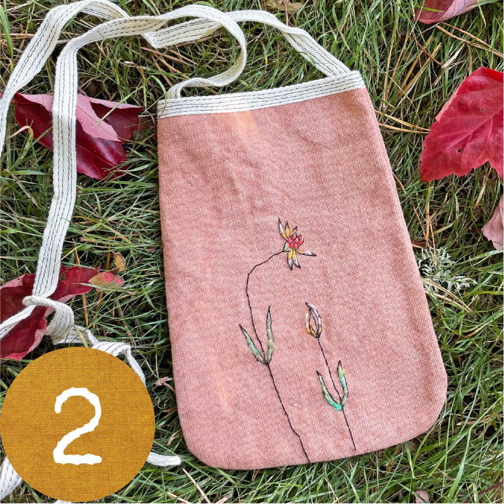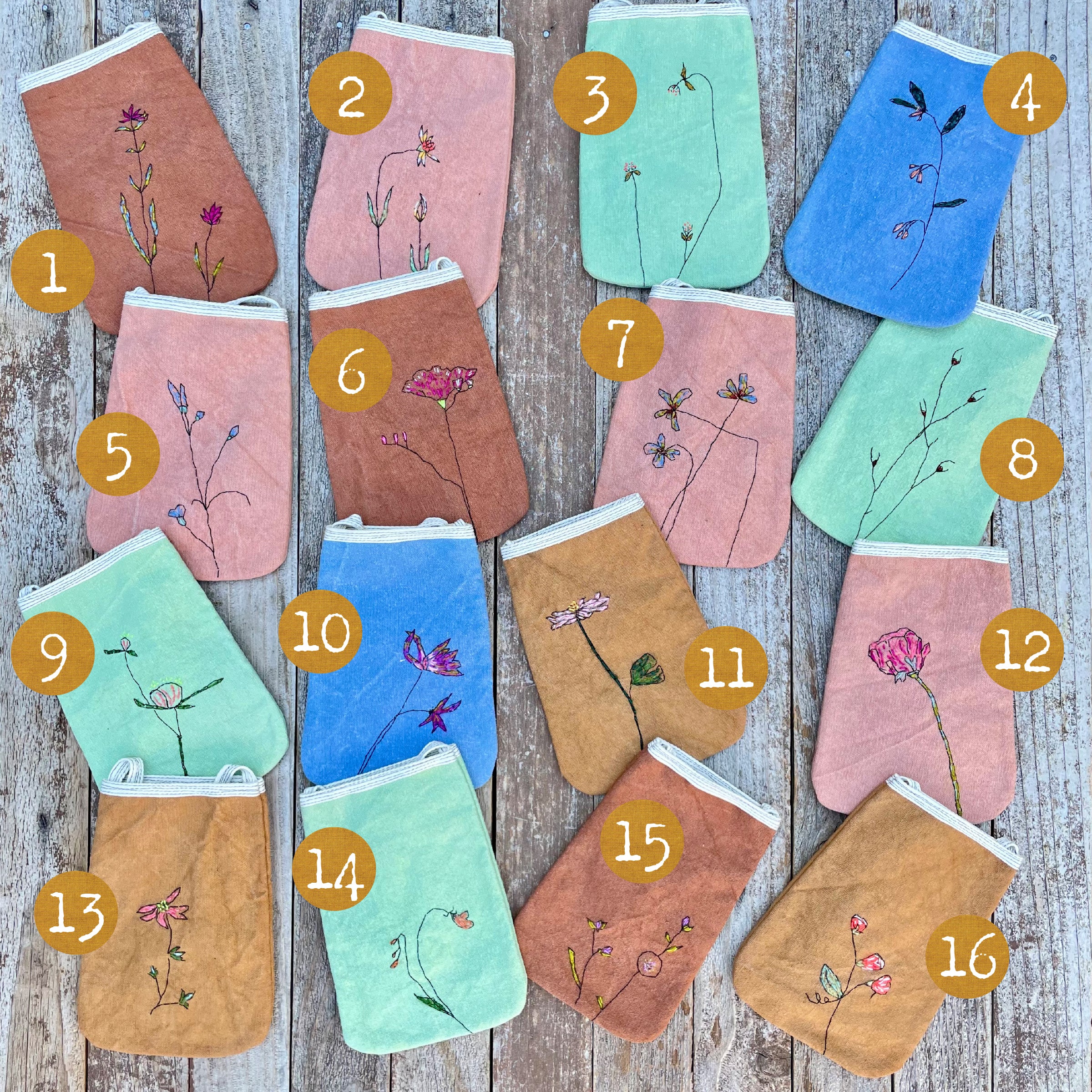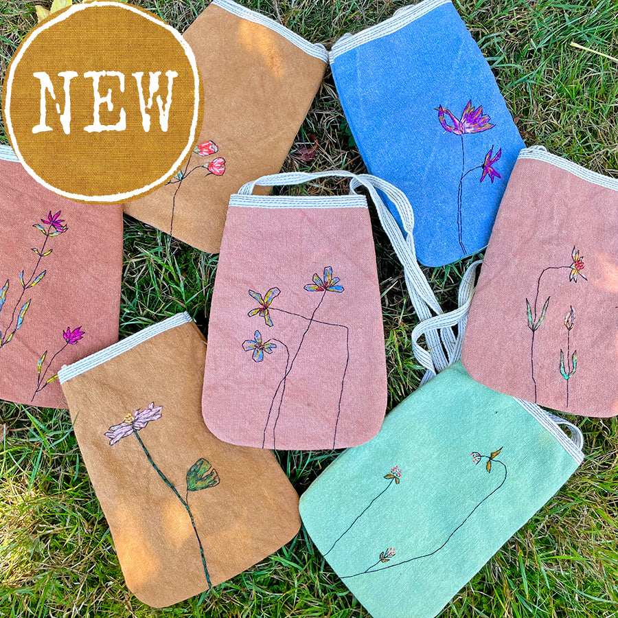 This collection of one-of-a-kind pocket purses is stitched with botanicals using my favorite mohair/silk yarn from the Lamb & Kid. This perfect little purse can be worn cross-body, over your shoulder, or around your waist. Purses are made from plant-dyed organic cotton/hemp fabric. Each purse is machine-stitched and has an adjustable cotton strap. Measures 7” tall and 5.5” at the bottom, with a slight taper to the top to a 4.5” opening; two cotton twill straps measure 27” each. Delicate wash, line dry.