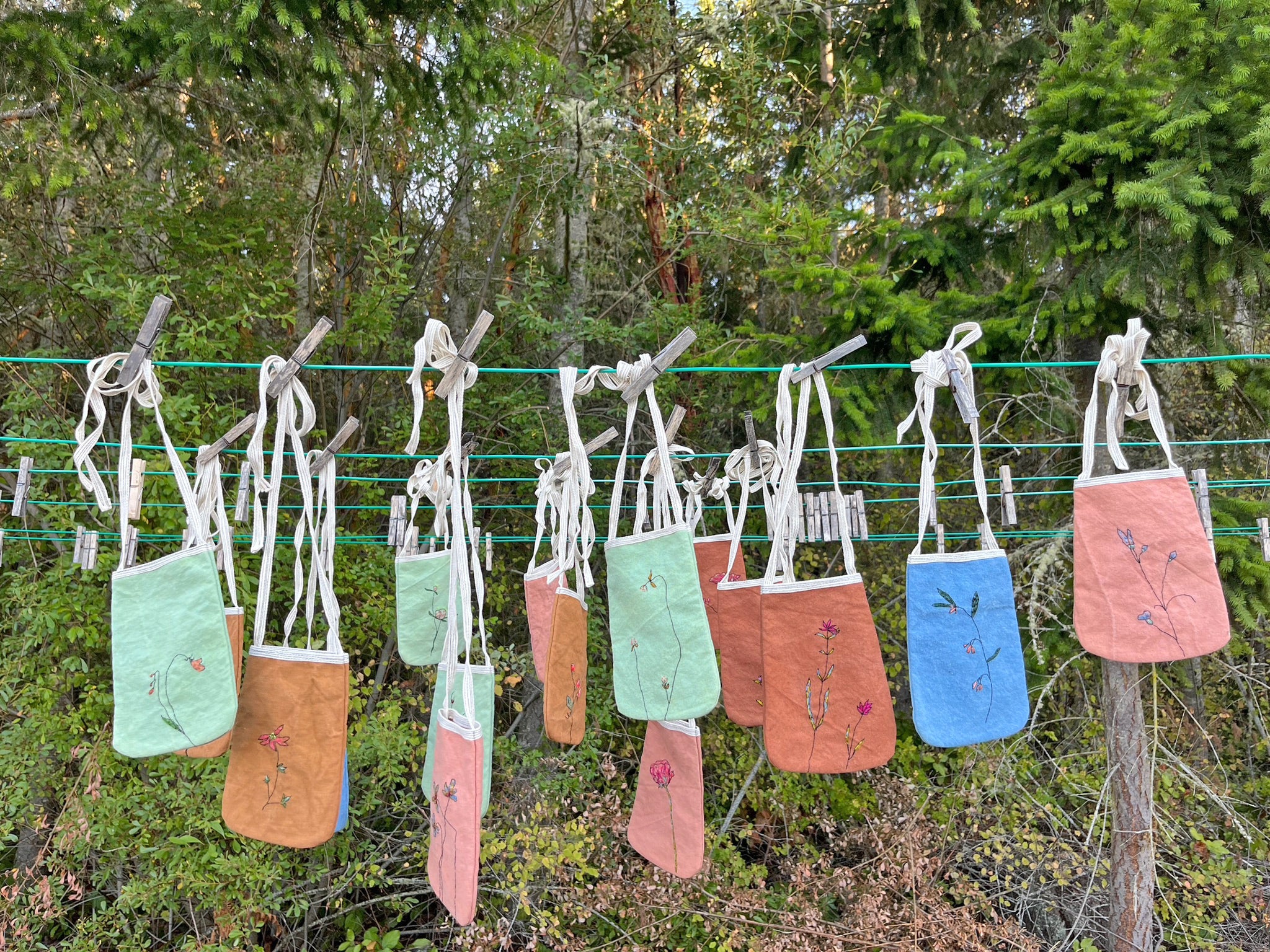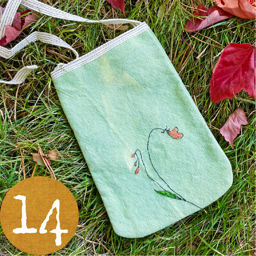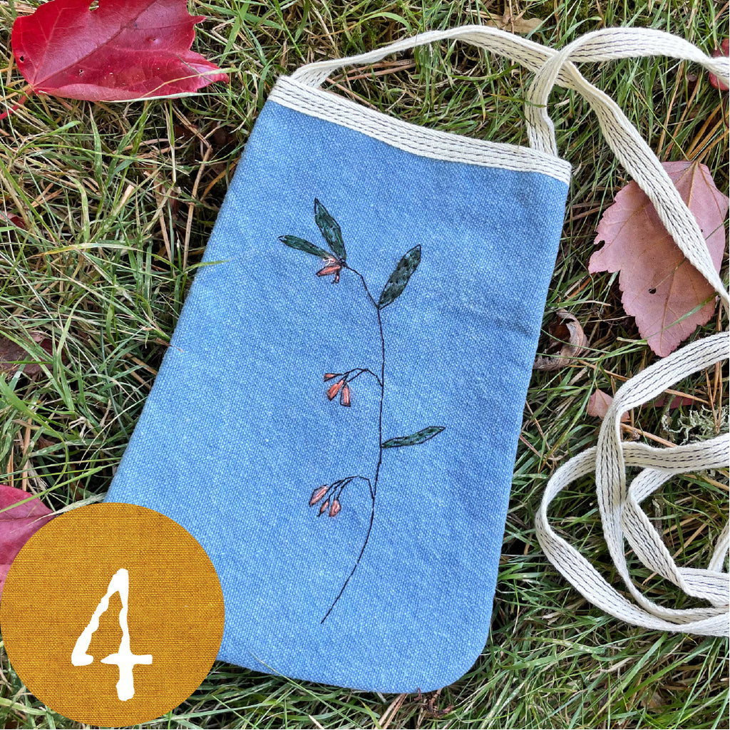 This collection of one-of-a-kind pocket purses is stitched with botanicals using my favorite mohair/silk yarn from the Lamb & Kid. This perfect little purse can be worn cross-body, over your shoulder, or around your waist. Purses are made from plant-dyed organic cotton/hemp fabric. Each purse is machine-stitched and has an adjustable cotton strap. Measures 7” tall and 5.5” at the bottom, with a slight taper to the top to a 4.5” opening; two cotton twill straps measure 27” each. Delicate wash, line dry.